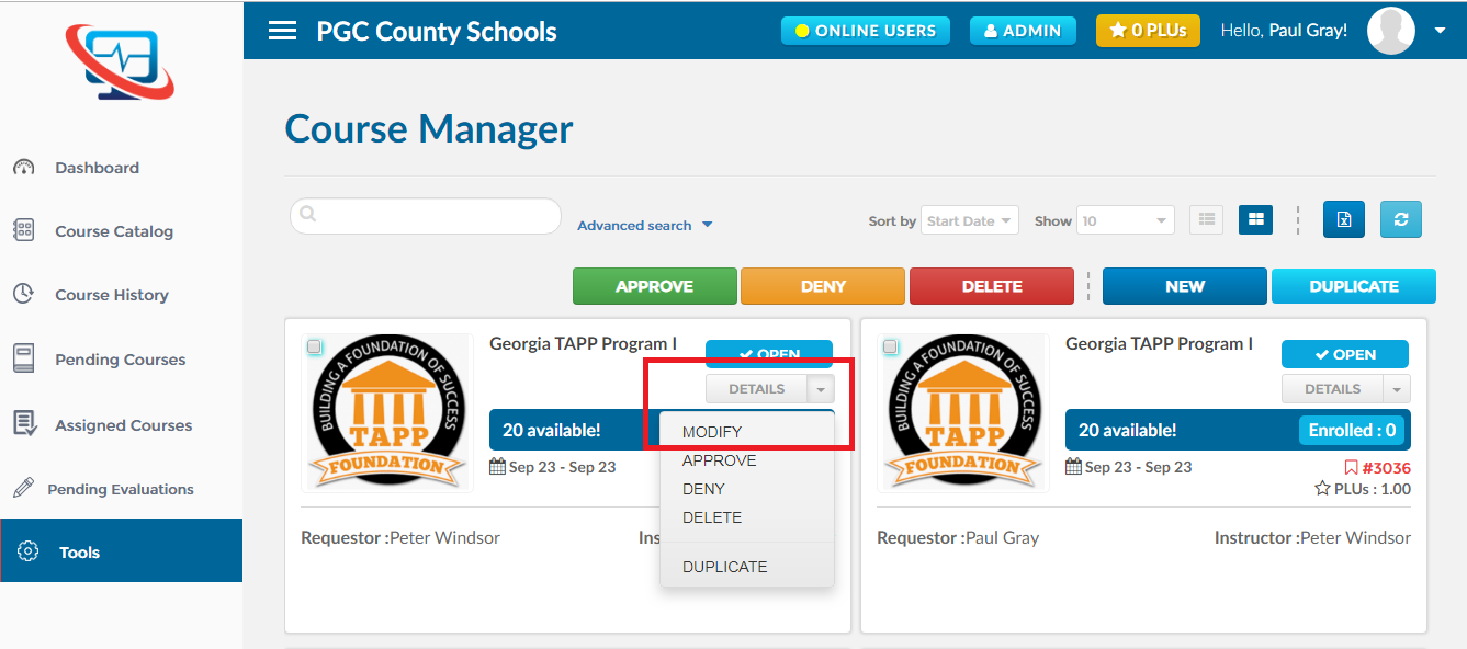 2. Click on ‘Modify’ as shown below, it will take you to the ‘Update Course’ page.